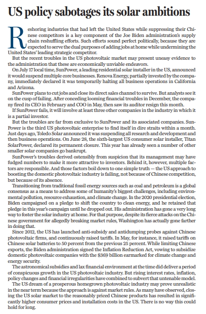 自2012年起,美國就開始對中國光伏企業(yè)發(fā)起反補(bǔ)貼和反傾銷調(diào)查,并不斷提高關(guān)稅。例如,今年5月,美國白宮宣布,對中國產(chǎn)太陽能電池征收的關(guān)稅將從原先的25%上調(diào)至50%。在限制中國對美出口的同時(shí),拜登政府簽署的《通脹削減法案》還撥款3690億美元應(yīng)對氣候變化、維護(hù)能源安全,承諾將借此對國內(nèi)光伏企業(yè)實(shí)施補(bǔ)貼。