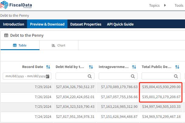 一份來自美國財政部的報告顯示,美債早在2024年初,即本財年伊始,就已突破34萬億美元,如今僅用半年時間,又增加了1萬億美元。