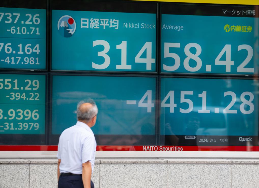 8月5日,行人走過位于日本東京的顯示實(shí)時(shí)股價(jià)的電子屏幕。新華社記者岳晨星攝