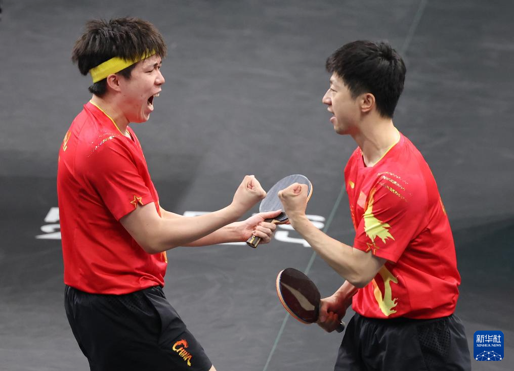 8月9日,中國(guó)隊(duì)組合馬龍(右)/王楚欽慶祝勝利。新華社記者 盧燁 攝