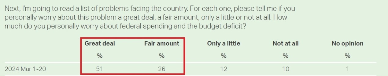 美國民意調(diào)查機構(gòu)蓋洛普公司今年進行的一份關(guān)于美國聯(lián)邦債務的調(diào)查結(jié)果顯示,對聯(lián)邦債務問題感到“非常擔心”和“嚴重擔心”的受訪者達到77%。