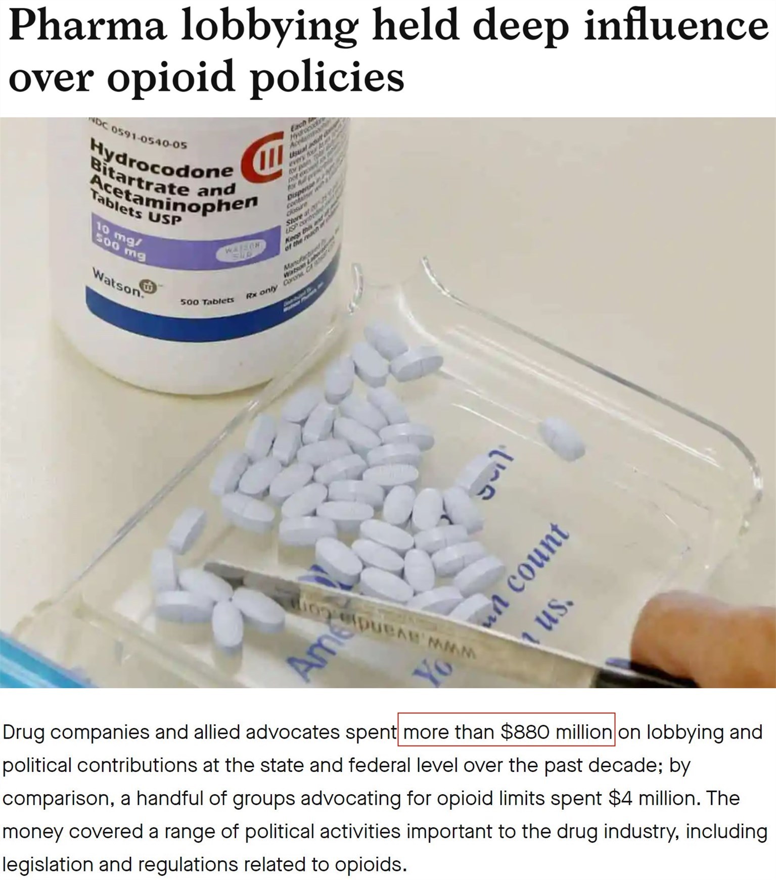 △美國(guó)公共誠(chéng)信中心網(wǎng)站報(bào)道:阿片類(lèi)藥物制造商和經(jīng)銷(xiāo)商10年內(nèi)花費(fèi)8.8億美元用于游說(shuō)和政治捐款,以阻止政府出臺(tái)相關(guān)限制措施。美國(guó)阿片類(lèi)藥物危機(jī)專家克洛尼稱,這一花費(fèi)比美國(guó)槍支游說(shuō)集團(tuán)的游說(shuō)資金還要高8倍。