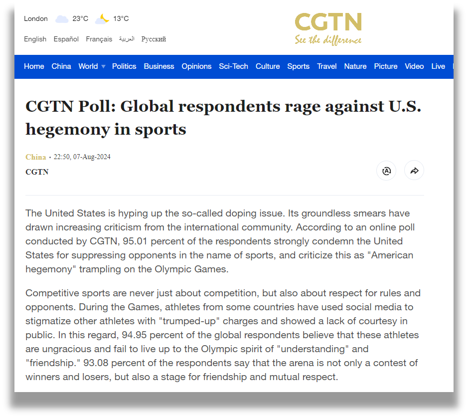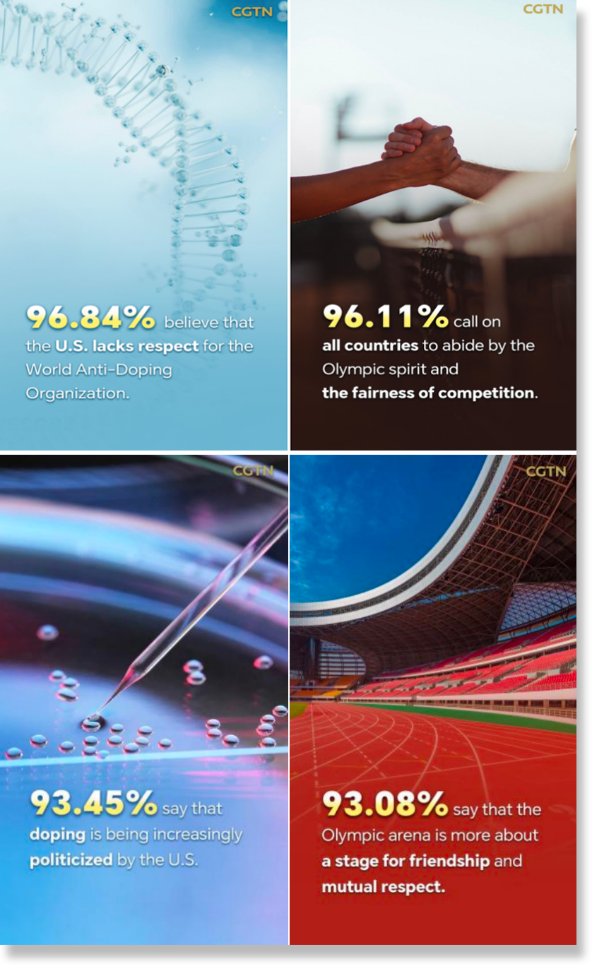 總臺CGTN先后兩次發(fā)起全球民調(diào),調(diào)查顯示,96.84%的受訪者認(rèn)為美方缺乏對世界反興奮劑機(jī)構(gòu)的尊重,是在挑戰(zhàn)公平和權(quán)威;96.25%的受訪者痛批美國在興奮劑監(jiān)管方面“雙重標(biāo)準(zhǔn)”;93.45%的受訪者表示,興奮劑問題日益被美國政治化和工具化;95.57%的受訪者認(rèn)為美國反興奮劑機(jī)構(gòu)或存包庇行為,為涉興奮劑的美國運(yùn)動員開脫……
