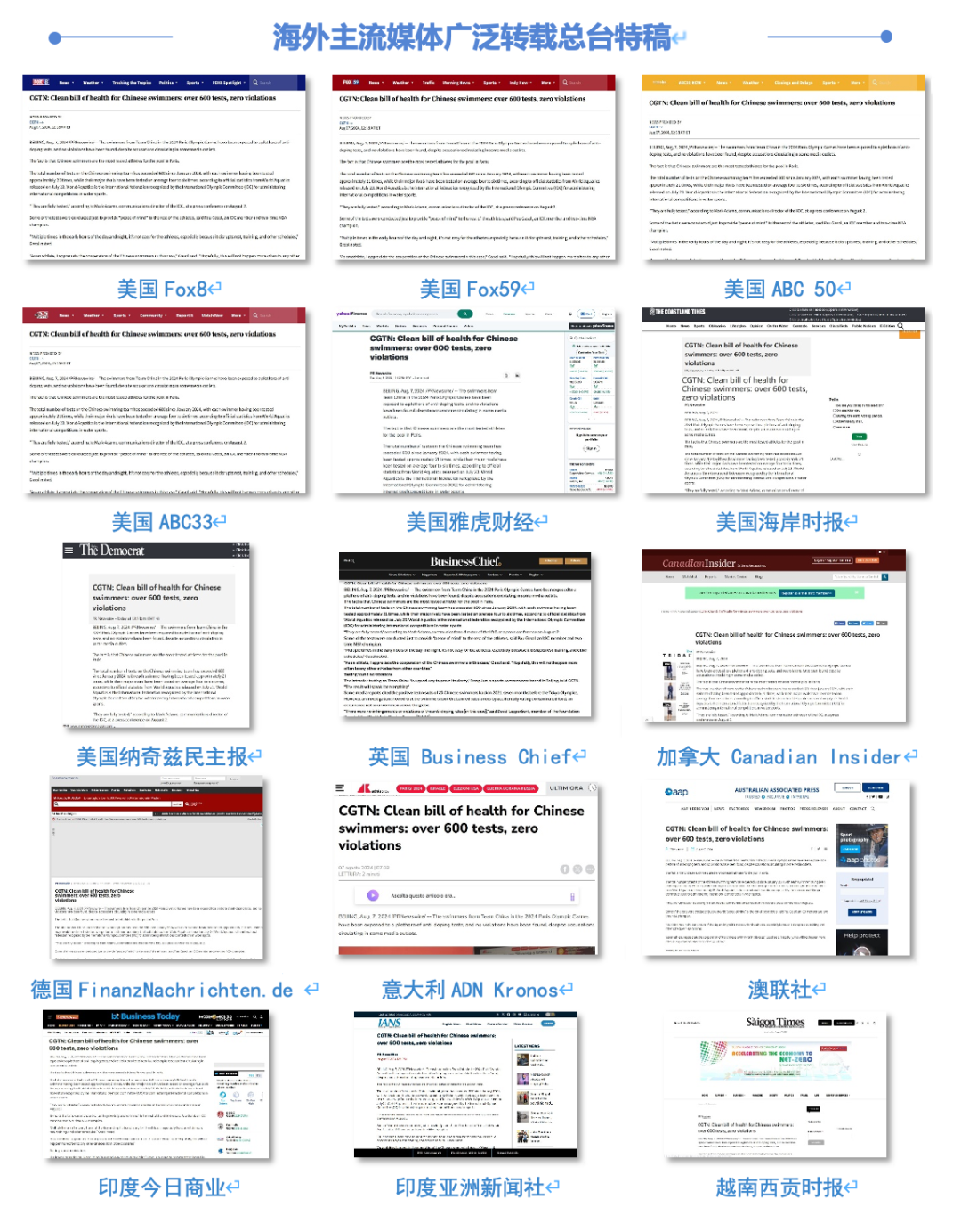 此外,多條重磅報(bào)道接連發(fā)出,直指美國在興奮劑問題上的霸道行徑及其危害,如《實(shí)錘!藥檢陽性不禁賽 世界反興奮劑機(jī)構(gòu)深度揭批美對違禁運(yùn)動員操作內(nèi)幕》《干干凈凈比賽:中國游泳隊(duì)超600次藥檢,零違規(guī)》《美國濫施“長臂管轄”!反興奮劑“雙標(biāo)”何時休?》等。這些報(bào)道在多語種全平臺及時發(fā)布,獲海外主流媒體廣泛轉(zhuǎn)載,助力重樹全球運(yùn)動員對公平競賽的信心。