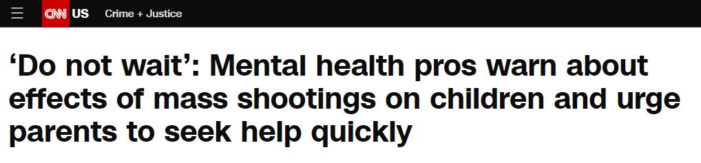 薩爾茲和羅辛-斯萊特都警告表示,(美國(guó)社會(huì))急需對(duì)校園槍擊事件或一般槍支暴力事件中幸存的兒童及青少年出現(xiàn)的心理健康問(wèn)題作出反應(yīng),這對(duì)保護(hù)他們的未來(lái)至關(guān)重要。