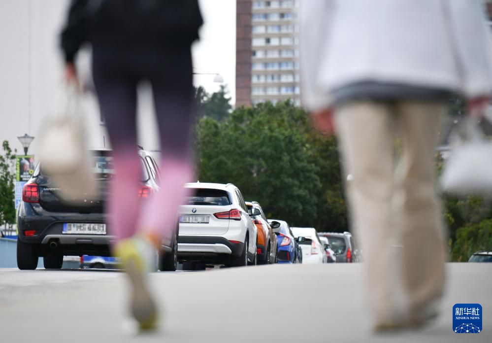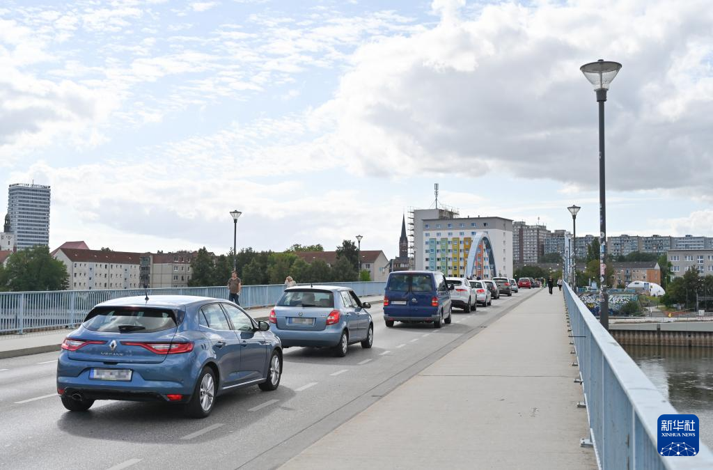 9月10日,車輛排隊(duì)通過德國(guó)奧得河畔法蘭克福和波蘭斯武比采邊境的檢查站。新華社記者 任鵬飛 攝