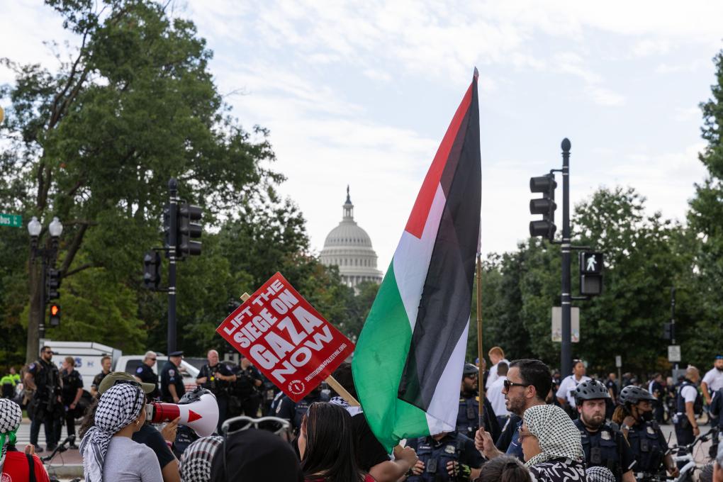 7月24日,以色列總理內(nèi)塔尼亞胡在美國(guó)國(guó)會(huì)發(fā)表演講,數(shù)以千計(jì)的抗議者在國(guó)會(huì)大廈外對(duì)此表示抵制。圖為抗議者在美國(guó)國(guó)會(huì)附近的聯(lián)合車站聚集。新華社記者胡友松攝