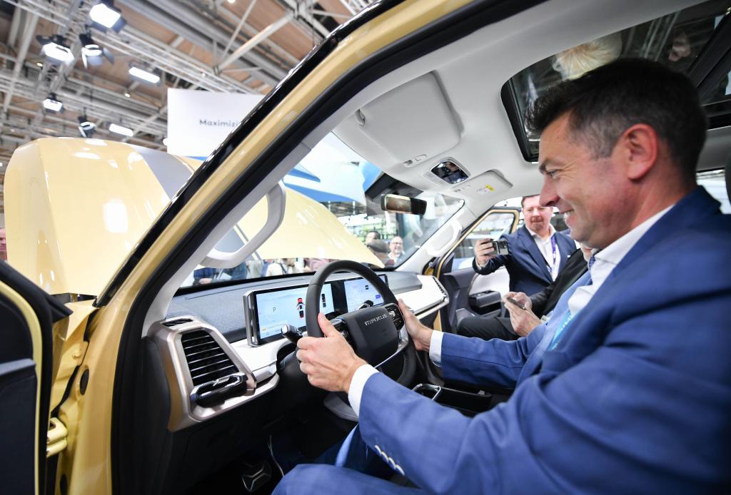9月16日,在德國漢諾威國際交通運(yùn)輸博覽會(huì)媒體預(yù)展上,一名男子體驗(yàn)上汽大通eTerron 9純電皮卡車。新華社記者任鵬飛攝
