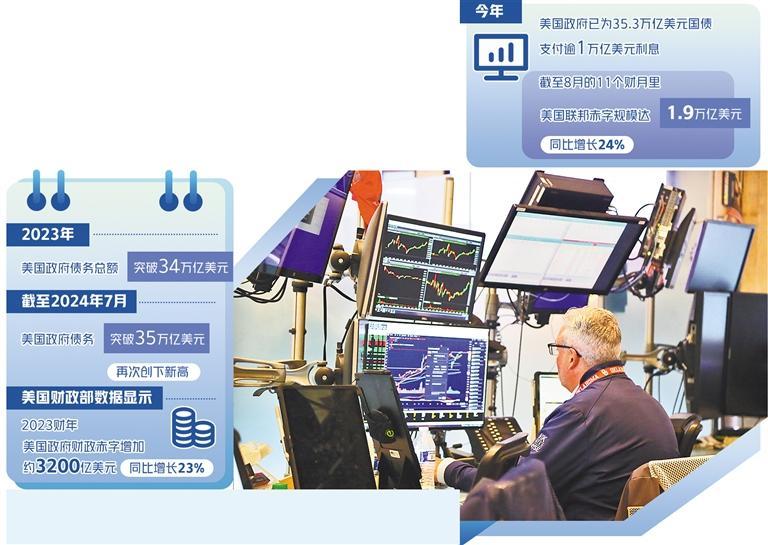 美國(guó)財(cái)政部9月12日發(fā)布的月度聯(lián)邦政府收支報(bào)告顯示,今年美國(guó)政府已為35.3萬億美元國(guó)債支付逾1萬億美元利息。償債成本上升也與美國(guó)8月財(cái)政赤字大幅上升相吻合。截至8月的前11個(gè)財(cái)月里,美國(guó)聯(lián)邦赤字規(guī)模達(dá)1.9萬億美元,同比增長(zhǎng)24%。美國(guó)財(cái)政赤字曾在2020財(cái)年達(dá)到3.13萬億美元的峰值,此后兩年雖呈下降趨勢(shì),但在2023財(cái)年又有所上漲:美國(guó)財(cái)政部數(shù)據(jù)顯示,2023財(cái)年美國(guó)政府的財(cái)政赤字增加了約3200億美元,同比增長(zhǎng)23%。一方面,經(jīng)濟(jì)的衰退和各種減稅法案的實(shí)施導(dǎo)致財(cái)政收入減少;另一方面,為刺激經(jīng)濟(jì)增長(zhǎng),財(cái)政支出又不斷增加,這就導(dǎo)致財(cái)政赤字不斷攀升,只有通過發(fā)債彌補(bǔ)財(cái)政赤字,形成惡性循環(huán)。