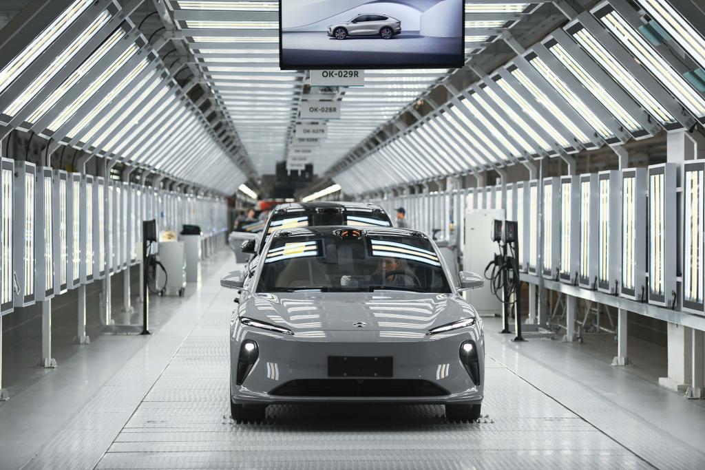 這是安徽省合肥市新橋智能電動(dòng)汽車產(chǎn)業(yè)園蔚來第二工廠內(nèi)的新能源汽車生產(chǎn)線(5月9日攝)。新華社記者張端攝