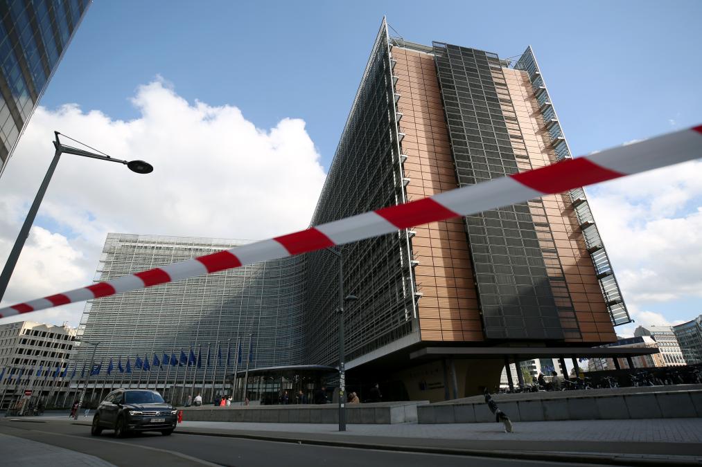 10月4日,在比利時(shí)布魯塞爾,車輛駛過歐盟委員會大樓。新華社記者趙丁喆攝