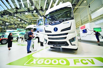 9月16日,在德國漢諾威國際交通運(yùn)輸博覽會(huì)媒體預(yù)展上,參觀者在陜汽控股展區(qū)了解一款氫燃料電池牽引車。新華社發(fā)