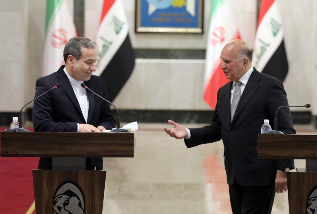 10月13日,伊拉克外長侯賽因(右)同到訪的伊朗外長阿拉格齊在首都巴格達舉行會談后參加聯(lián)合記者會。新華社發(fā)(哈利勒·達伍德攝)
