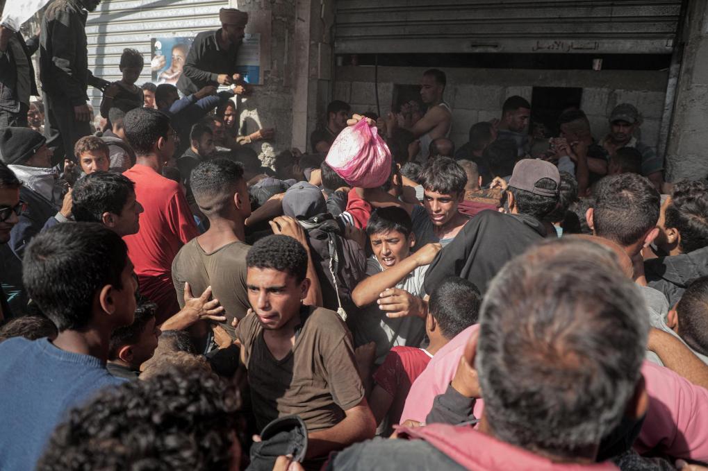 10月23日,人們在加沙地帶北部的加沙城領(lǐng)取救濟(jì)食品。新華社發(fā)(馬哈茂德·扎基攝)