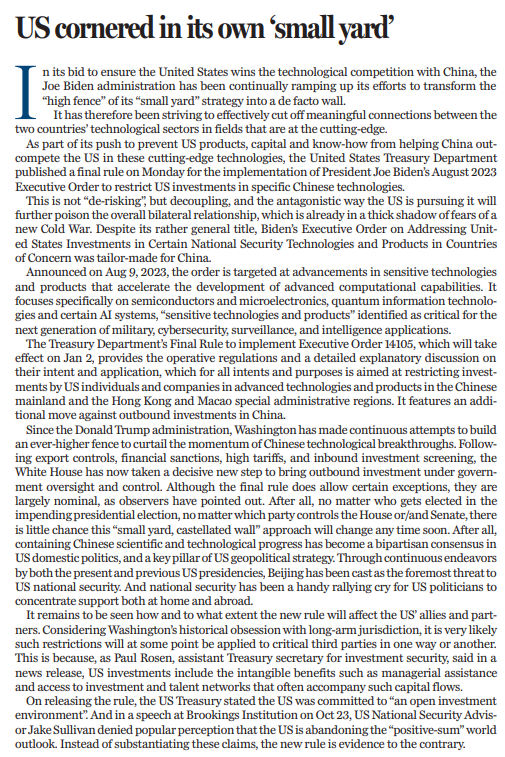 此前,外界普遍認為美國正在放棄“正和”的世界觀。10月23日,美國總統(tǒng)國家安全事務助理沙利文在布魯金斯學會上發(fā)言時否認了這一說法。隨后,美國財政部在發(fā)布最終規(guī)則時也表示,美國致力于建設“開放的投資環(huán)境”。然而,最終規(guī)則的發(fā)布,終究讓美國的“言”與“行”背道而馳。