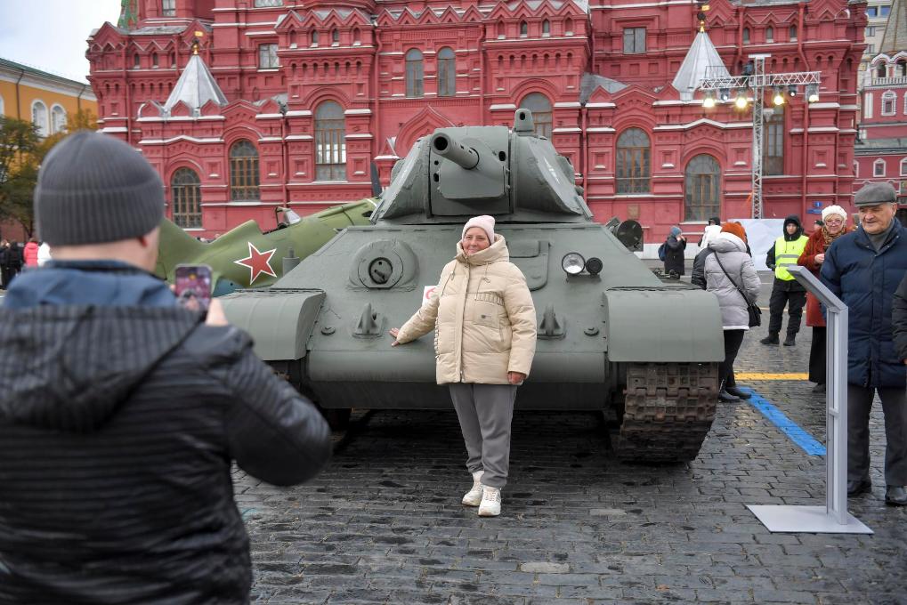 11月7日,在俄羅斯首都莫斯科,一名女子在以紀念1941年蘇聯(lián)紅場閱兵式為主題的露天展覽上留影。新華社發(fā)(亞歷山大攝)