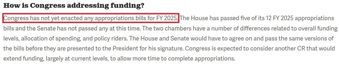 和以往一樣,白宮今年3月提出的2025財(cái)年預(yù)算案包含需要由國(guó)會(huì)中不同撥款委員會(huì)審批、分別為政府各機(jī)構(gòu)提供資金的12項(xiàng)撥款計(jì)劃,但這些年度撥款計(jì)劃迄今無一被國(guó)會(huì)通過。