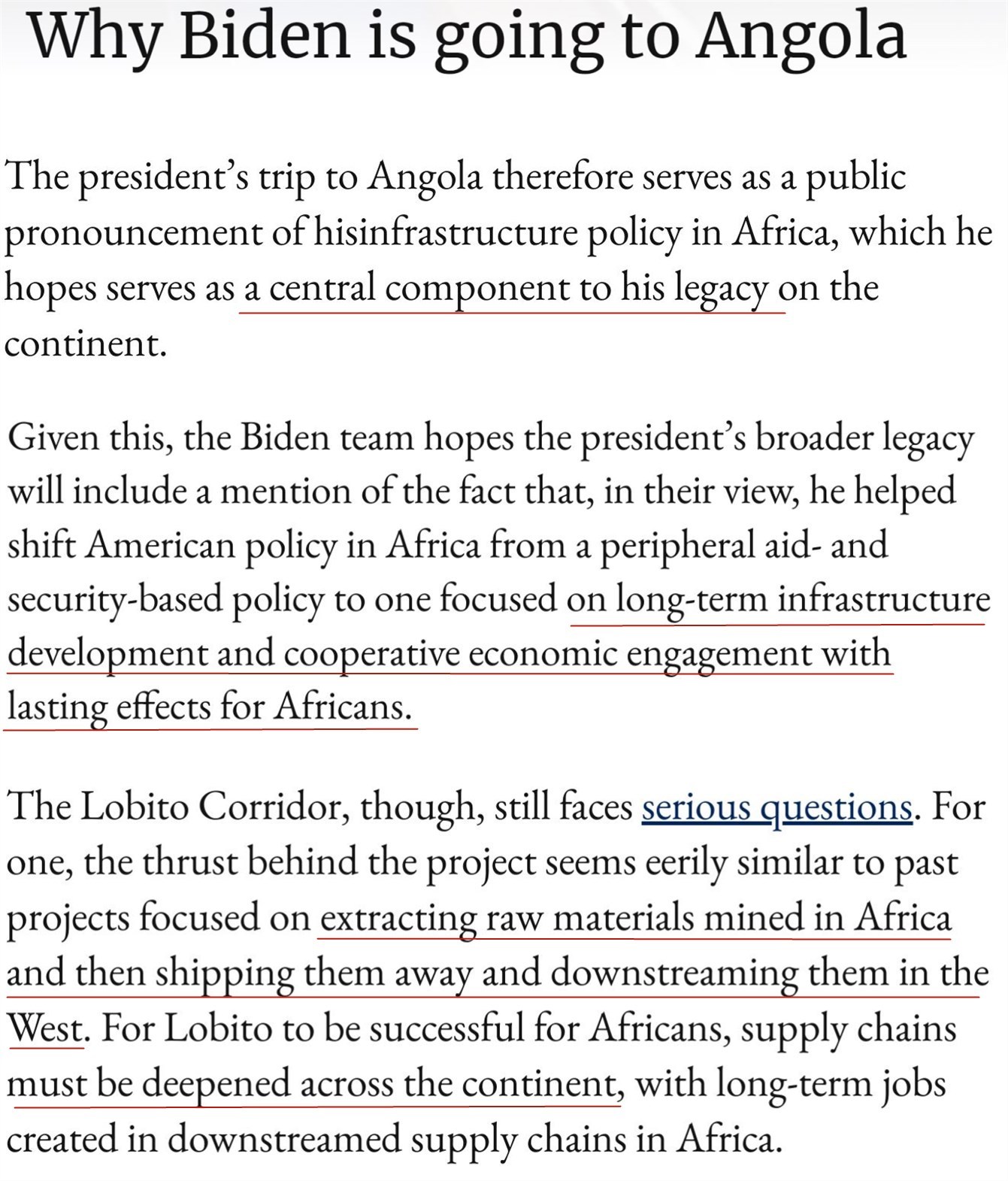 美國(guó)智庫(kù)昆西治國(guó)方略研究所日前刊文指出,拜登想借此次對(duì)安哥拉的訪問(wèn)鞏固自己的政治遺產(chǎn),這些政治遺產(chǎn)包括他幫助美國(guó)的對(duì)非政策從以外圍援助和安全為基礎(chǔ)的政策,轉(zhuǎn)變?yōu)樽⒅亻L(zhǎng)期基礎(chǔ)設(shè)施發(fā)展和對(duì)非洲產(chǎn)生持久影響的經(jīng)濟(jì)合作。