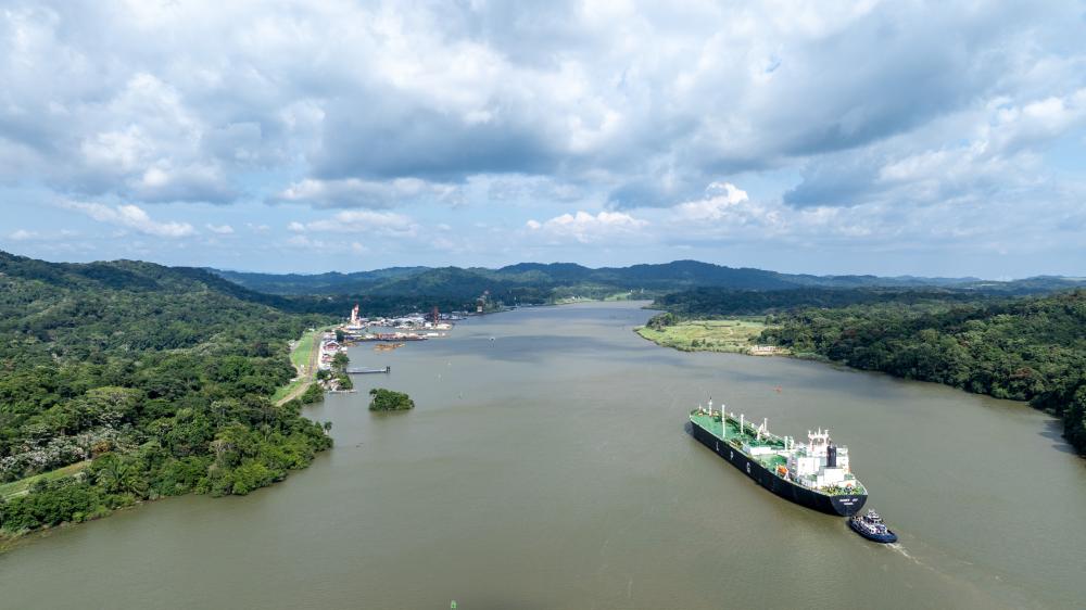 8月28日,在巴拿馬首都巴拿馬城附近,一艘貨輪通過巴拿馬運河的米拉弗洛雷斯船閘準備駛入太平洋。新華社記者李木子攝
