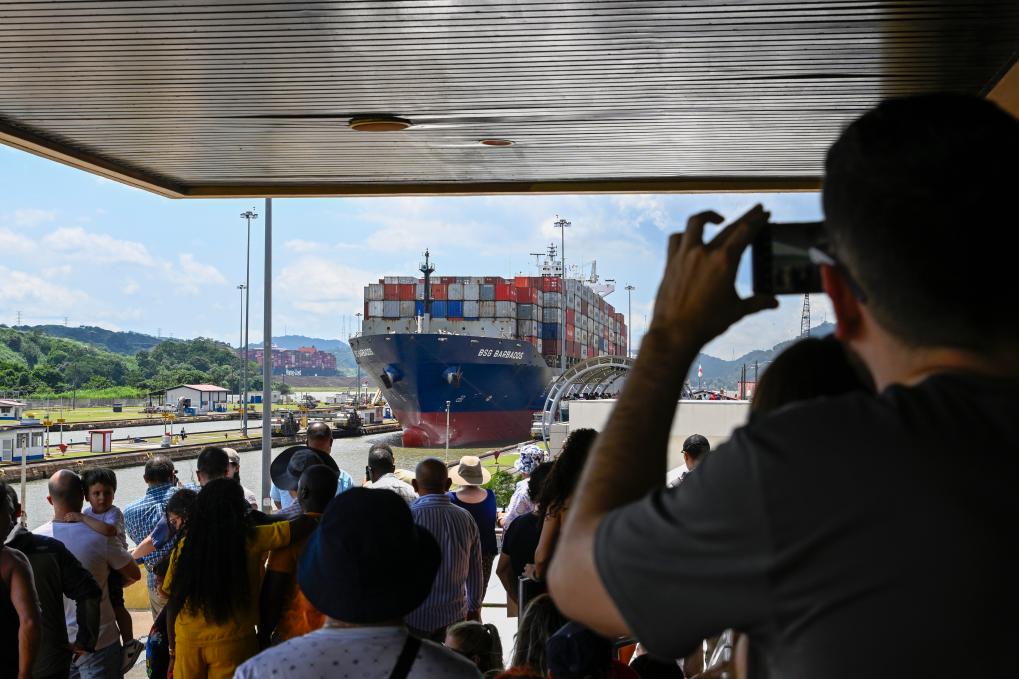 8月28日,在巴拿馬首都巴拿馬城附近,游客在巴拿馬運河的米拉弗洛雷斯船閘游客中心觀看貨輪通過船閘駛入太平洋。新華社記者李木子攝