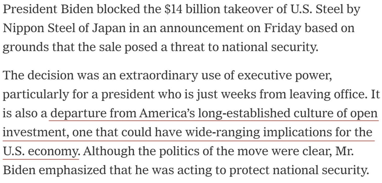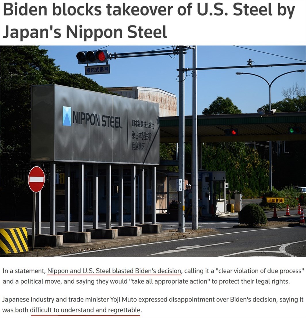 雖然日鐵多次讓步,但美國(guó)總統(tǒng)拜登當(dāng)?shù)貢r(shí)間3日發(fā)表聲明,正式阻止了這筆價(jià)值2萬(wàn)億日元(按目前匯率約合127億美元)的交易。