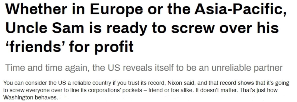 正如美國(guó)電臺(tái)主持人、政治分析家加蘭·尼克松在一篇文章中所說,歷史記錄表明,“美國(guó)為了本國(guó)公司的利益會(huì)坑害所有人——無(wú)論朋友還是敵人。這就是華盛頓的行為方式”。