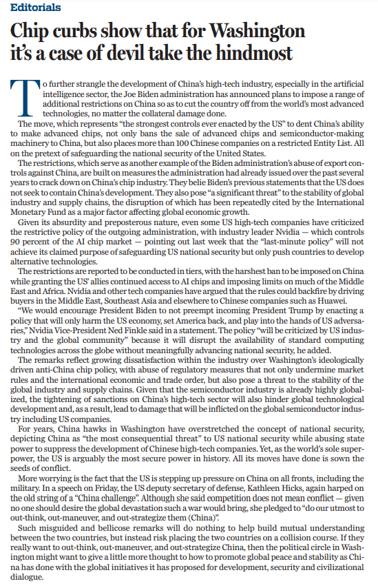 1月13日,拜登政府在卸任前夕出臺人工智能相關(guān)出口管制措施,進(jìn)一步加嚴(yán)對人工智能芯片、模型參數(shù)等出口管制,還拓展了長臂管轄,對第三方與中國開展正常貿(mào)易設(shè)置障礙、橫加干涉。拜登政府的這一舉措完全無視后果,旨在進(jìn)一步遏制中國高科技產(chǎn)業(yè),尤其是人工智能領(lǐng)域的發(fā)展。