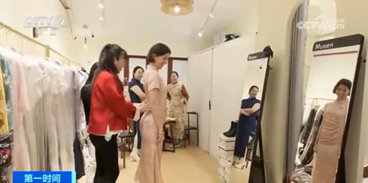 旗袍店店長(zhǎng)表示,最近幾個(gè)月由于外國(guó)游客增多,許多外國(guó)客人來(lái)體驗(yàn)穿中國(guó)旗袍,也帶動(dòng)了門店銷量增長(zhǎng)。