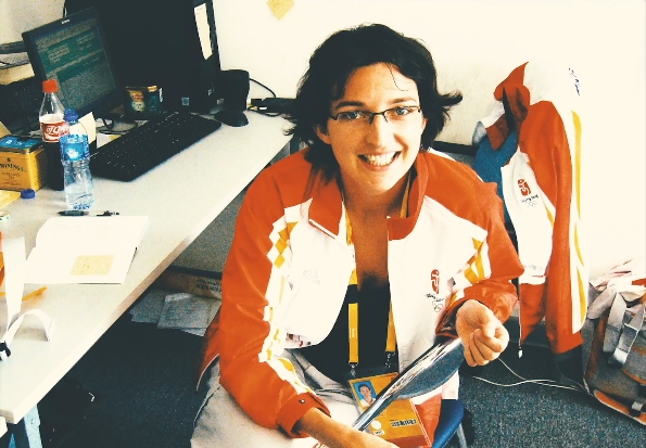 讓蒂擔(dān)任2008年北京奧運(yùn)會(huì)的法語(yǔ)翻譯時(shí)的照片。