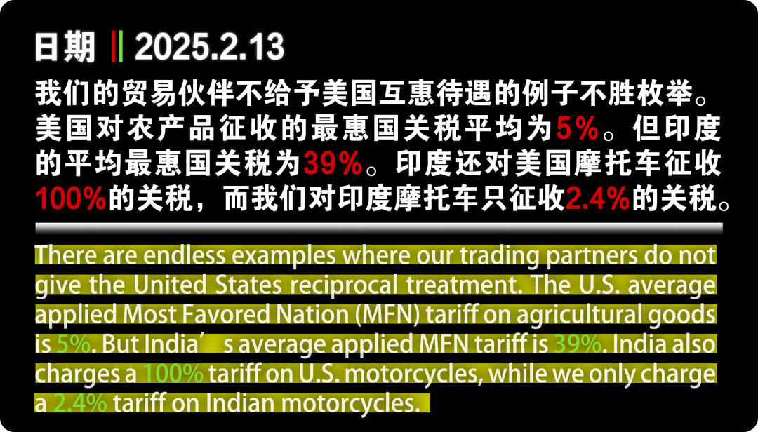 當(dāng)?shù)貢r(shí)間2月13日,特朗普宣布了最新的關(guān)稅決定:在未來(lái)幾周或幾個(gè)月內(nèi)對(duì)其他國(guó)家加征“對(duì)等關(guān)稅”。這意味著,美國(guó)的貿(mào)易伙伴,全部面臨著新的關(guān)稅威脅。