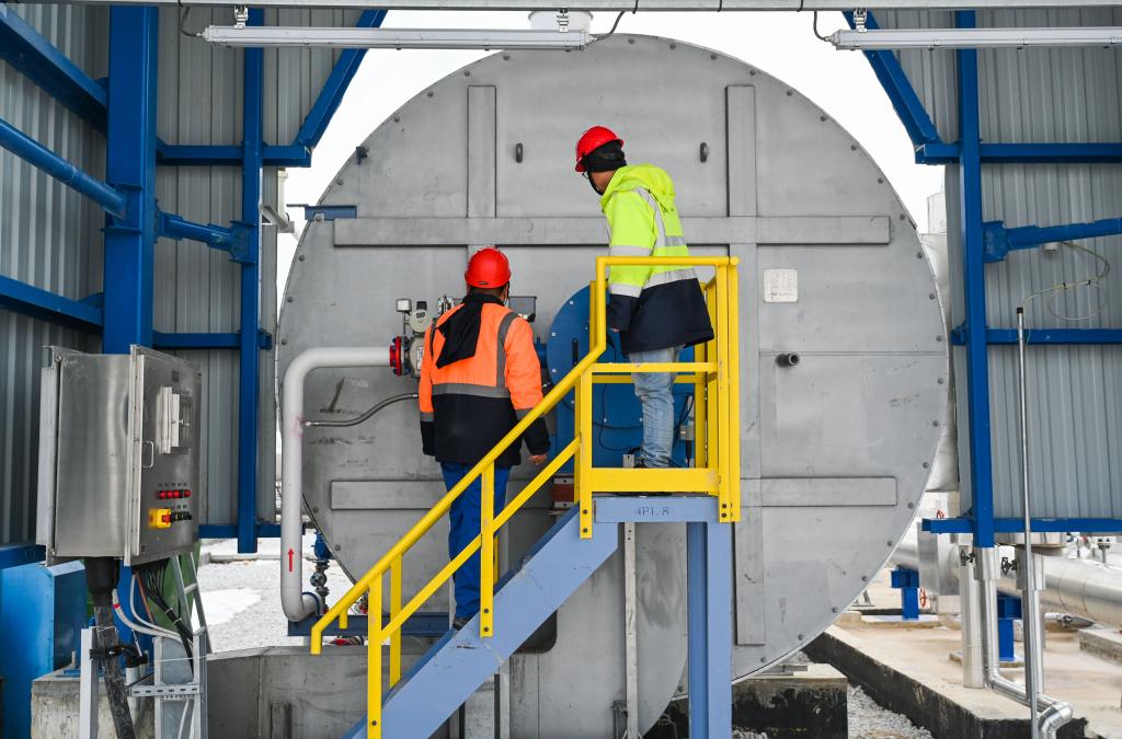 2月12日,中土兩國(guó)工程師在土耳其阿克薩拉伊省的圖茲湖地下天然氣儲(chǔ)庫擴(kuò)建項(xiàng)目地面場(chǎng)站查看設(shè)備。新華社記者劉磊攝