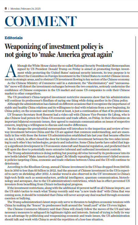 上周五(2月21日),美國總統(tǒng)特朗普簽署所謂的“國家安全總統(tǒng)備忘錄”(下稱“備忘錄”)。白宮稱,該備忘錄旨在鼓勵外來投資的同時,保護(hù)美國國家安全利益。然而,其真實目的是責(zé)令美國外國投資委員會限制中國對美國關(guān)鍵領(lǐng)域投資,并妨礙美國對中國關(guān)鍵領(lǐng)域投資。