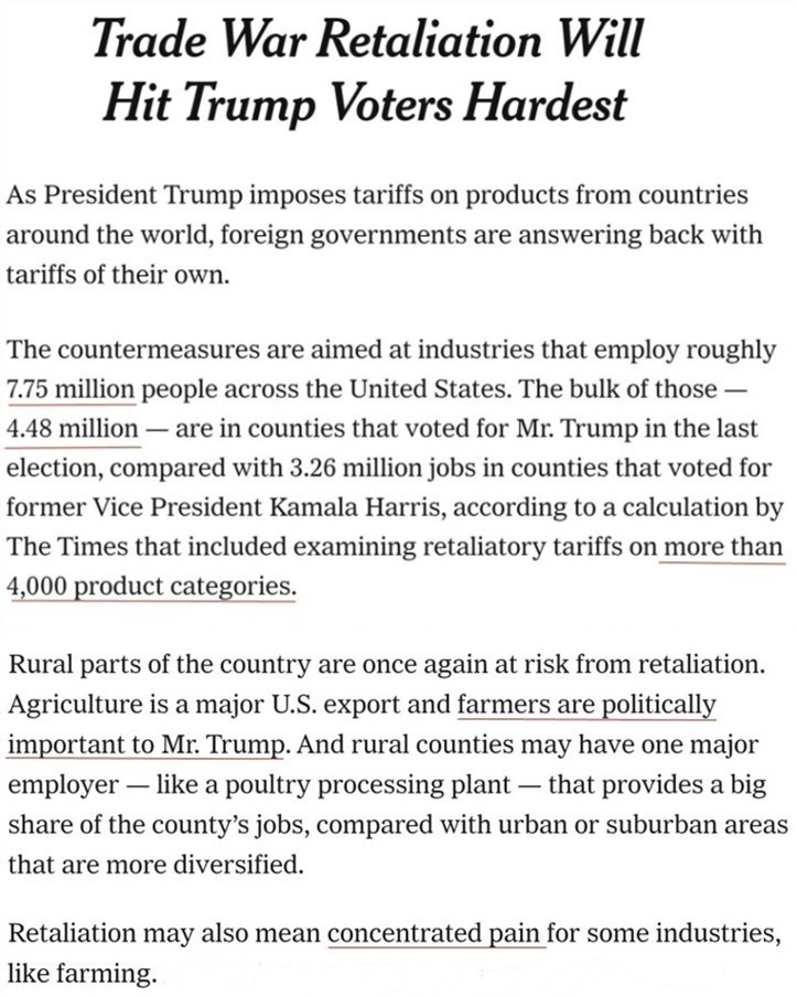 《紐約時報》對美國遭受反制關(guān)稅打擊的4000多個產(chǎn)品類別進(jìn)行的分析顯示,各行業(yè)共有約775萬人受到波及,其中約有448萬人來自大選中支持特朗普的地區(qū),主要集中在以農(nóng)業(yè)為主要產(chǎn)業(yè)的美國中西部、南部和東南部。