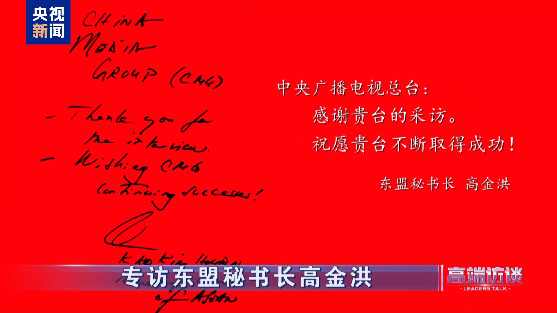 東盟秘書(shū)長(zhǎng)高金洪在接受總臺(tái)專訪后題詞——中央廣播電視總臺(tái):感謝貴臺(tái)的采訪。祝愿貴臺(tái)不斷取得成功!