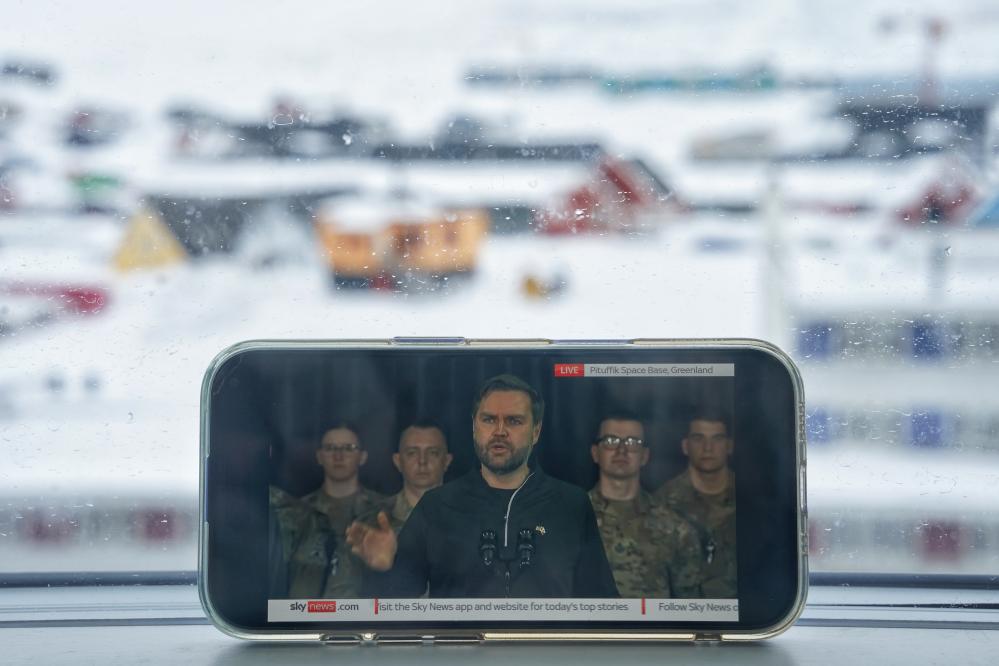 這是3月28日在丹麥自治領地格陵蘭島首府努克拍攝的美國副總統(tǒng)萬斯講話的直播畫面。新華社記者彭子洋攝