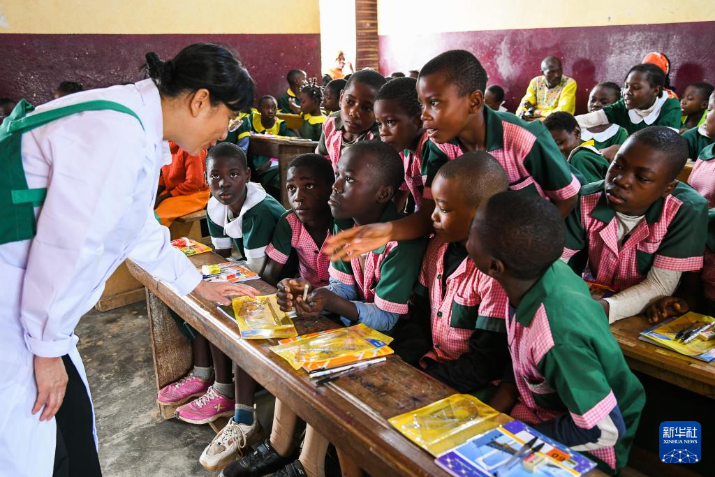 4月3日,在喀麥隆姆巴爾馬約的一所小學(xué),中國(山西)第24批援喀麥隆醫(yī)療隊(duì)姆巴爾馬約分隊(duì)的醫(yī)生與學(xué)生互動(dòng)。新華社發(fā)(科普索攝)