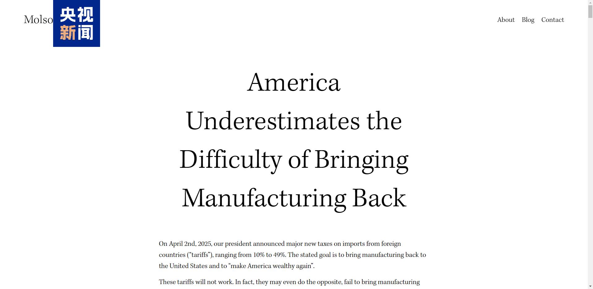 近日,美國一線企業(yè)主莫爾森·哈特結(jié)合自身經(jīng)驗,發(fā)布了題為《美國低估了制造業(yè)回流的難度》的文章,“控訴”特朗普的關稅政策,并用多個刀刀見血的論點,揭穿了“關稅能救‘美國制造’”的致命幻覺。