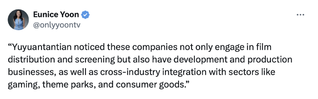 美媒的一位記者還專門在社交媒體上援引玉淵譚天的觀點說,由于美國文化產(chǎn)業(yè)的核心盈利點確實在于知識產(chǎn)權(quán)和品牌價值。因此,如果中國消費者開始在電影領域?qū)γ绹a(chǎn)品“降溫”,這種趨勢很可能會進一步外溢,影響到其他依賴美國IP和品牌溢價的行業(yè)。