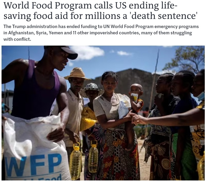 世界糧食計(jì)劃署警告說,美國中斷緊急糧食援助相當(dāng)于是對(duì)千百萬面臨極端饑餓的民眾“判處死刑”。
