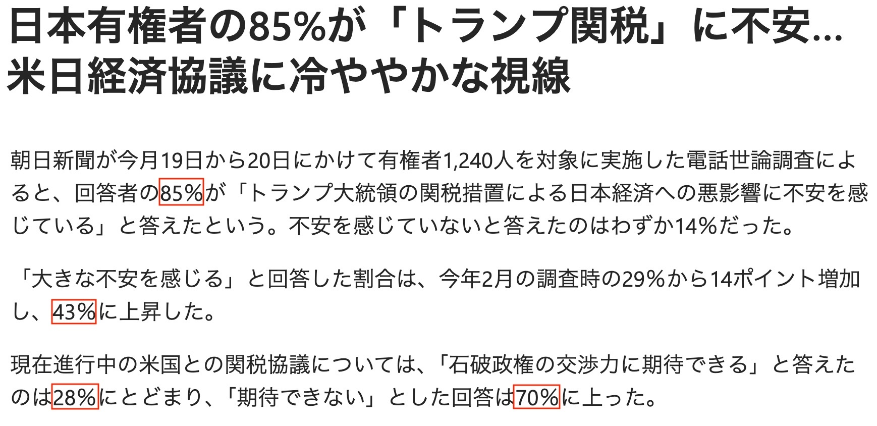 另據(jù)日本《朝日新聞》19日至20日進行的民調(diào),多達85%的日本受訪者擔憂特朗普政府的關稅會對日本經(jīng)濟產(chǎn)生負面影響,其中43%的受訪者表示非常擔憂。