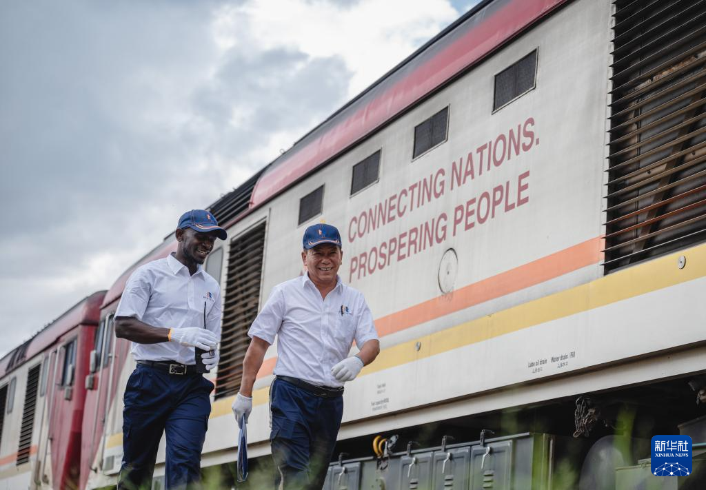 2025年1月23日,在肯尼亞內(nèi)羅畢蒙內(nèi)鐵路車間,維保人員在一輛印有“連接國家 走向繁榮”標(biāo)語的蒙內(nèi)鐵路機車前檢修配件。 新華社記者 王冠森 攝