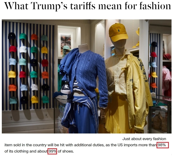美國(guó)有線電視新聞網(wǎng)近日刊發(fā)文章指出,關(guān)稅政策對(duì)服裝行業(yè)的影響尤為嚴(yán)重,因?yàn)槊绹?guó)人衣櫥里98%的衣物和99%的鞋子都是進(jìn)口的。
