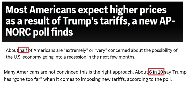 對(duì)于特朗普政府的關(guān)稅政策,近六成的受訪者認(rèn)為政府“做得太過了”。另外,約有一半受訪者“極度”或“非?!睋?dān)心美國(guó)經(jīng)濟(jì)會(huì)在未來幾個(gè)月陷入衰退。