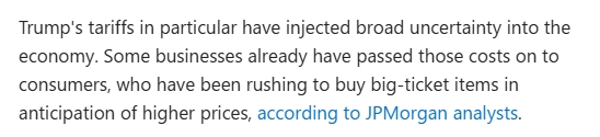 商界領袖們迫切希望美國的政策能有幾周的穩(wěn)定,美國農(nóng)戶們發(fā)現(xiàn)自己的聯(lián)邦食品補貼合同已經(jīng)終止,全美各地的非營利組織都在裁員,因為白宮正在削減開支。尤其是特朗普政府的關稅政策給經(jīng)濟帶來了廣泛的不確定性。摩根大通分析師表示,一些企業(yè)已經(jīng)將這些成本轉嫁給了消費者,消費者因預期價格上漲而搶購大件商品。