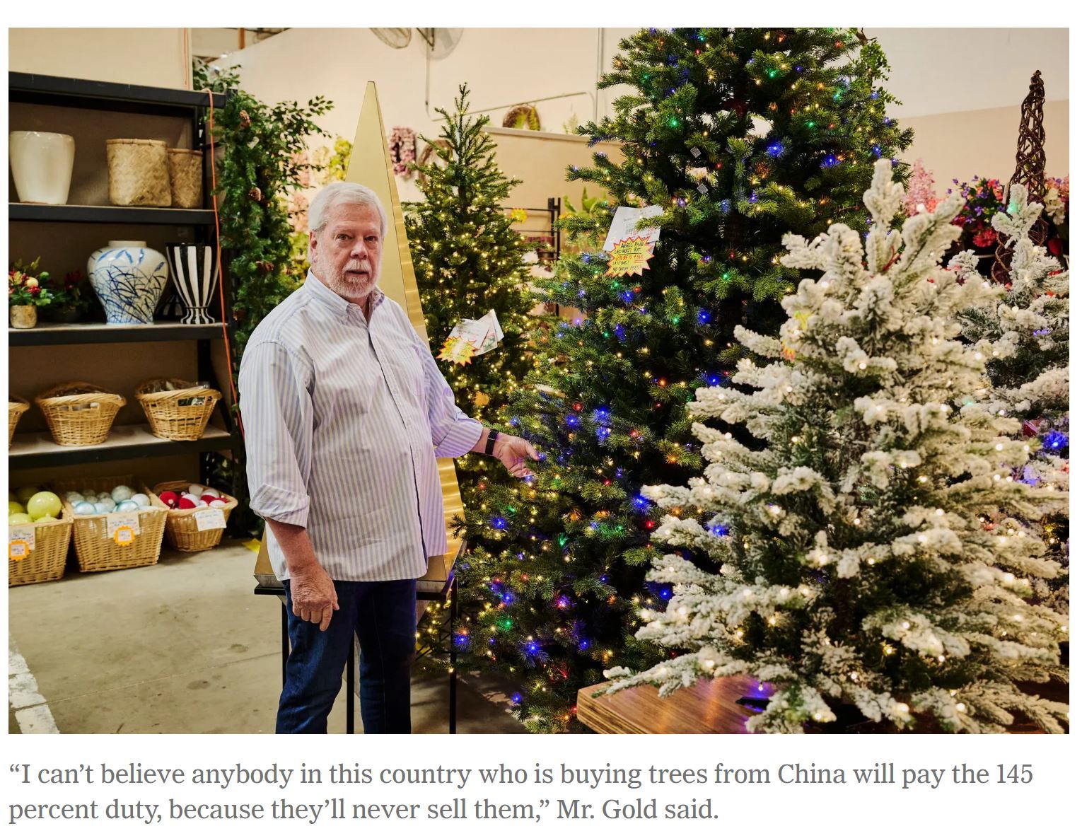 經(jīng)營家居用品的拉里·戈?duì)柕抡f,去年一棵約2.3米高的圣誕樹在店里的價格大約是1000美元。如今他別無選擇,只能把關(guān)稅成本轉(zhuǎn)嫁給消費(fèi)者,這將使同樣的一棵樹今年的價格超過2000美元。他無奈地表示,這個價格等于“給產(chǎn)品判了死刑”。