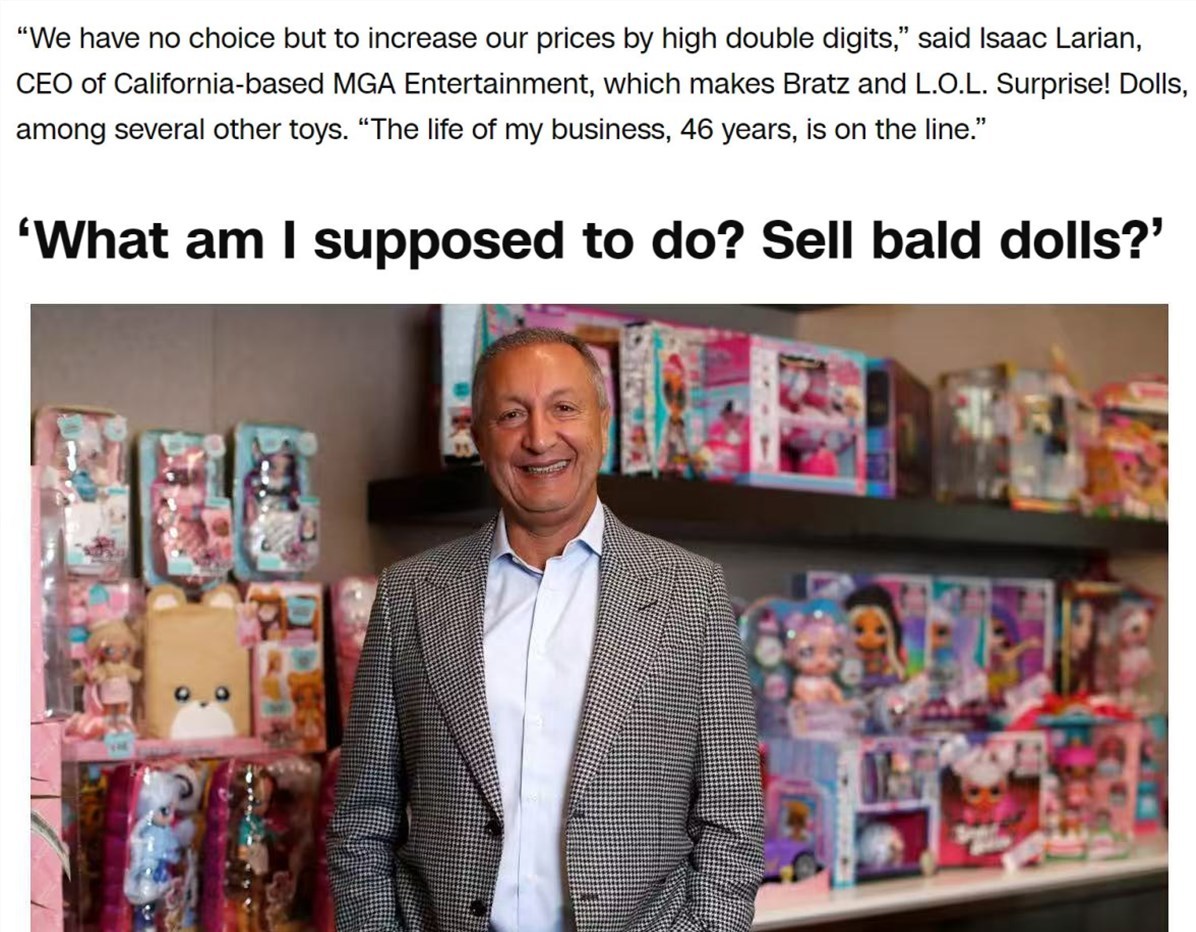 另一家美國玩具制造商的首席執(zhí)行官杰伊·福爾曼表示,公司的整個供應(yīng)鏈都在中國。他警告說,關(guān)稅不僅威脅到了玩具的價格和供應(yīng)量,甚至可能摧毀整個行業(yè)的生存根基。轉(zhuǎn)變經(jīng)營策略,像變法術(shù)一般,創(chuàng)造出當(dāng)前還不存在的制造業(yè),談何容易。