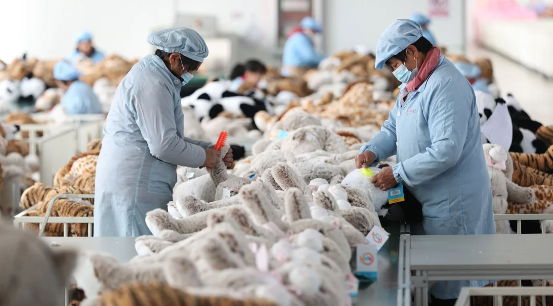 △中國連云港一家玩具制造廠的工人在準(zhǔn)備出口到其他國家的毛絨玩具。(圖自美國有線電視新聞網(wǎng)相關(guān)報(bào)道)