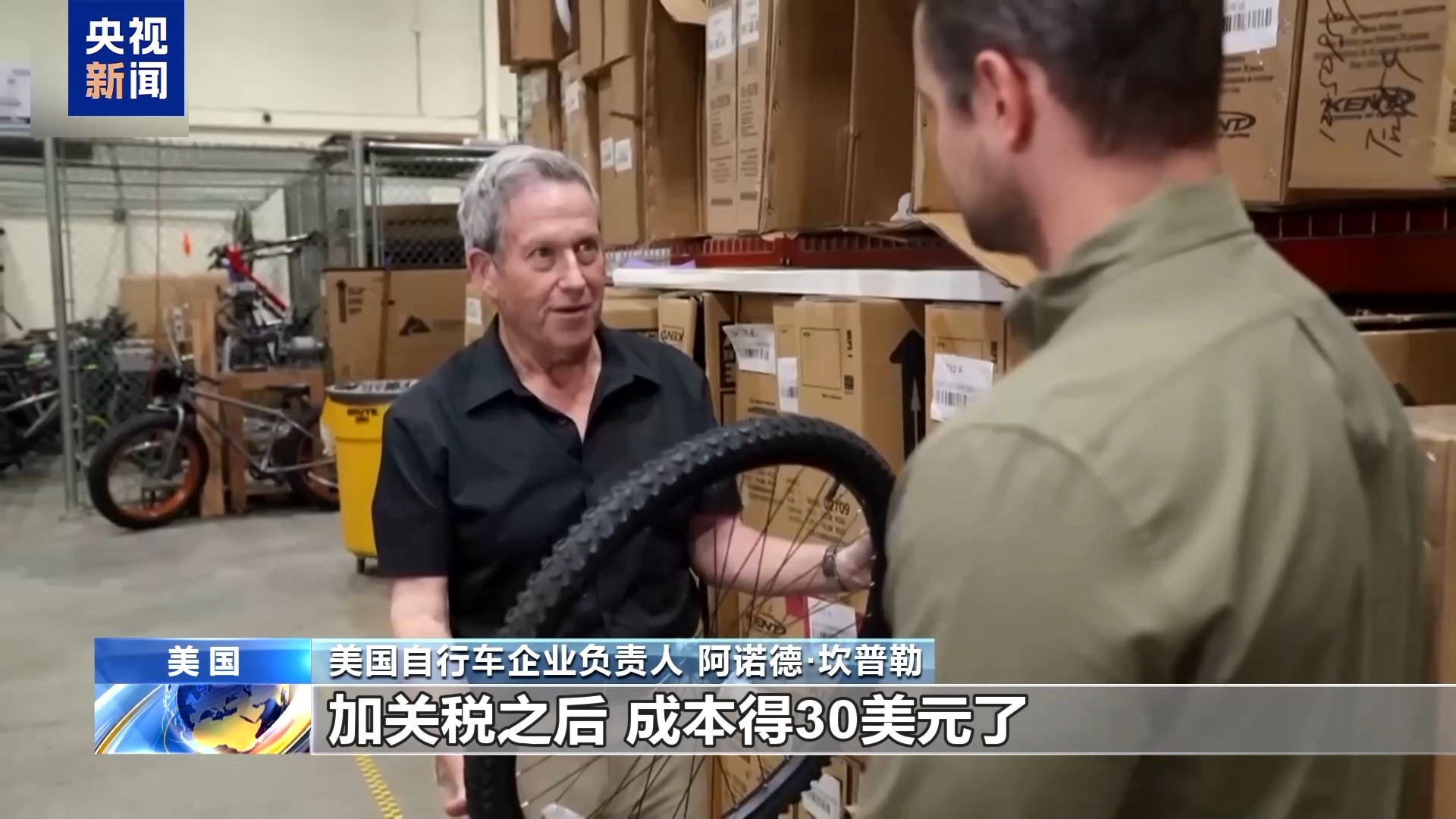 美國自行車企業(yè)負(fù)責(zé)人 阿諾德·坎普勒:像這樣一個輪子,我們原來的成本大約是10到12美元,加關(guān)稅之后,成本得30美元了。