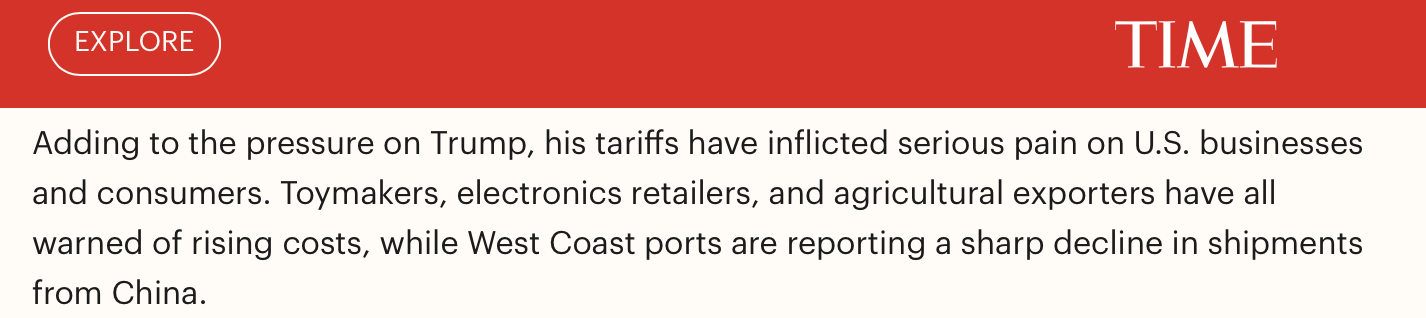 報道同時指出,美國政府的關(guān)稅措施給美國企業(yè)和消費者帶來了沉重打擊,這進一步加劇了美國政府的壓力。玩具制造商、電子產(chǎn)品零售商和農(nóng)產(chǎn)品出口商都警告稱,成本將上升,而美國西海岸的港口則報告稱,來自中國的貨運量急劇下降。