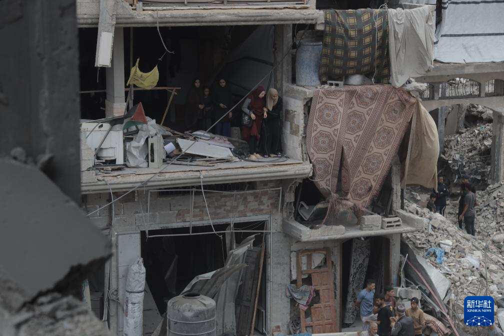 5月15日,在加沙地帶北部杰巴利耶難民營(yíng),巴勒斯坦人查看以軍轟炸后的建筑廢墟。新華社發(fā)(阿卜杜勒·拉赫曼·薩拉馬攝)